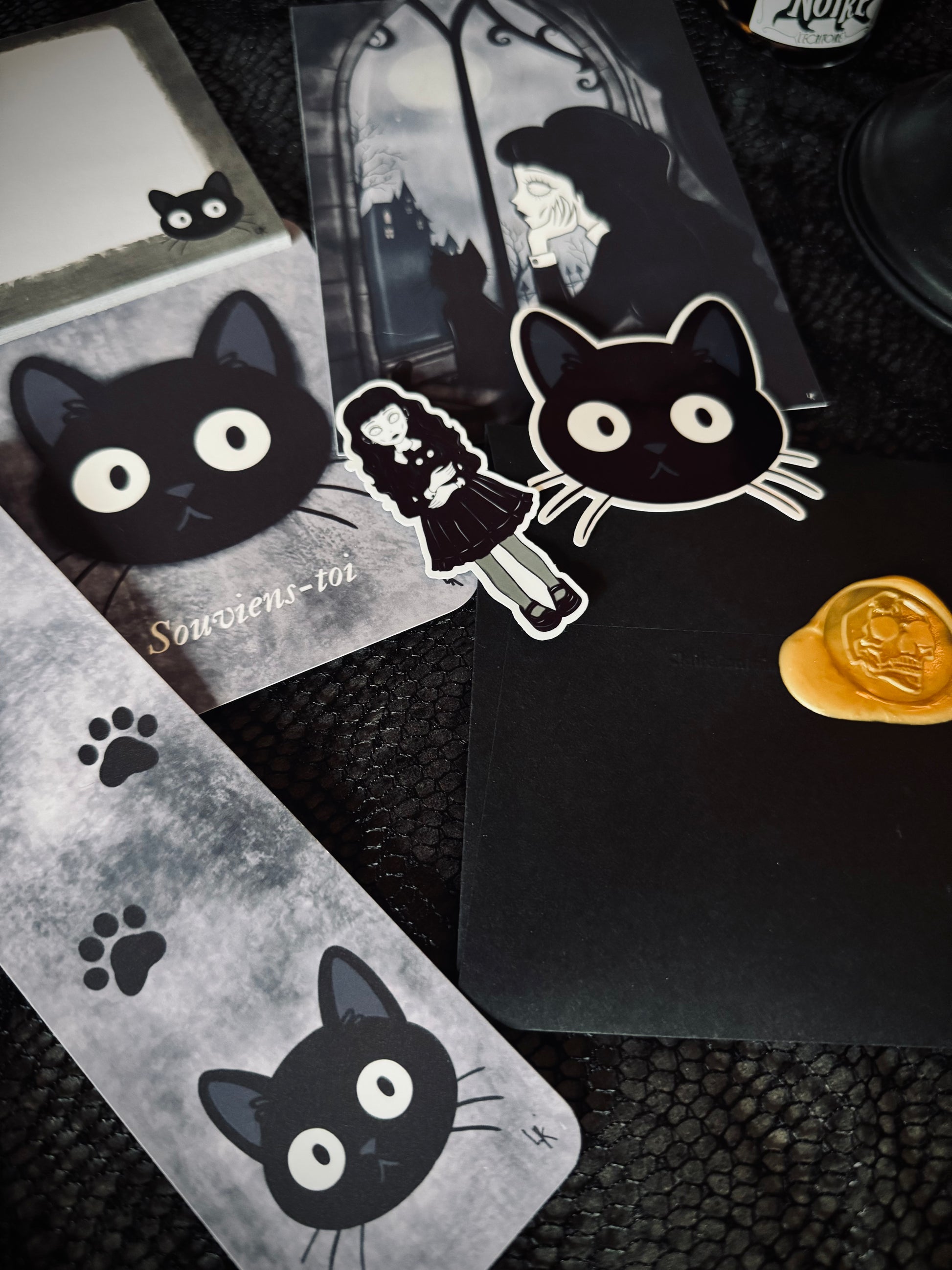 Le coffret Poe est une porte d'entrée dans l'univers du Manoir des Murmures. Les créations mettent en avant le petit chat noir qui semble observer le manoir.
